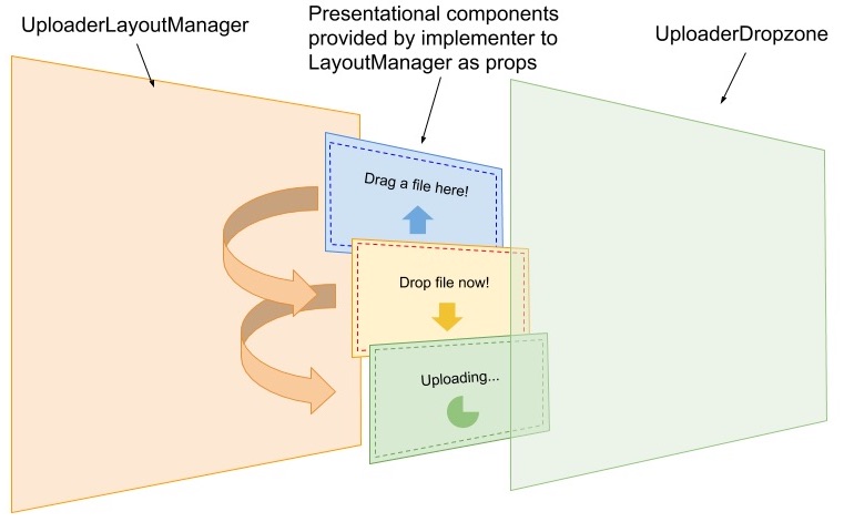 Le composant UploaderLayoutManager gère la plupart des transitions d'état et sait quelle disposition doit être affichée pour chaque étape du processus, tout en acceptant d'autres composants React comme accessoires pour chaque étape.